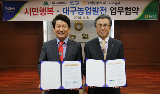 대구시(시장 권영진)와 농협 대구지역본부(본부장 안홍기)는 8일 농협 회의실에서 시민행복과 대구농업발전사업 공동추진을 위한 업무협약을 체결했다.