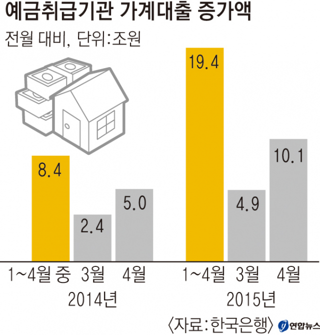 지난 4월 가계대출의 증가 폭이 월별 기준으로 사상 처음 10조원을 넘었다. 가계대출은 금융회사들이 가계에 빌려준 자금의 규모다.