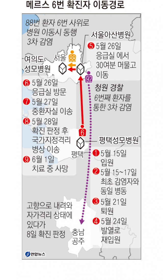 환자 추가 확진 과정에서 새로운 3차 감염 전파자가 확인된 점도 우려를 낳고 있다. 6번 환자와 15번(35) 환자에게 옮은 것으로 의심되는 감염 환자가 각각 2명이 더 나온 것이다. 이미 숨진 6번 환자는 사위인 88번 환자와 서울아산병원 청원경찰인 92번(28) 환자에게 메르스를 전파했다.