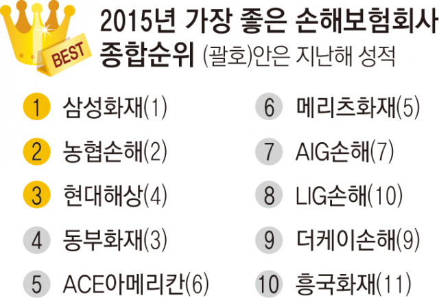삼성화재는 안정성(40%), 소비자성(30), 건전성(20%), 수익성(10%) 등 전 부문에서 고루 좋은 성적을 거뒀다. 지난 2012년 독립손해보험사로 출범한 농협손해는 기존 대형 손해보험회사들을 제치고 2위로 올라섰다.