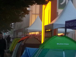 8일 오후 8시 대구 동구 안심역 코오롱하늘채 견본주택 앞. 땅거미가 어둑어둑 내려앉자 견본주택 앞에는 삼삼오오 무리가 모였다. 한쪽에선 텐트에 모기장을 치고 다른 쪽에선 돗자리를 깔았다. 오후 11시가 되자 무리는 더욱 늘었다. 텐트마다 모기향 냄새가 짙게 퍼져 나왔다. 자정이 넘자 여기저기서 코 고는 소리가 들렸다. 9일 아침이 되자 견본주택 앞에는 전날 밤을 텐트에서 지낸 이들과 함께 긴 인간띠가 형성됐다. 줄을 대신 서주고 돈을 받는 이른바 '줄값 아르바이트'와 커피와 떡을 파는 상인이 등장했다. 전날 새벽부터 줄을 서 9일 오후 3시에야 특별공급 청약을 할 수 있었다는 김모(32) 씨는 "다음번 특별공급 때는 전날 오후 6시부터 줄을 서야겠다"며 "여건이 안 된다면 줄값 10만원을 주고 아르바이트생을 고용하겠다"고 했다. 시공사인 '코오롱글로벌'에 따르면 이날 안심역 코오롱하늘채 아파트 특별공급 237가구 모집에 3천여 명이 접수를 했다. 안심역 코오롱하늘채는 5일 분양을 시작해 주말 동안 3만5천여 명의 방문객이 견본주택을 다녀가는 등 분양 흥행을 예고하고 있다.