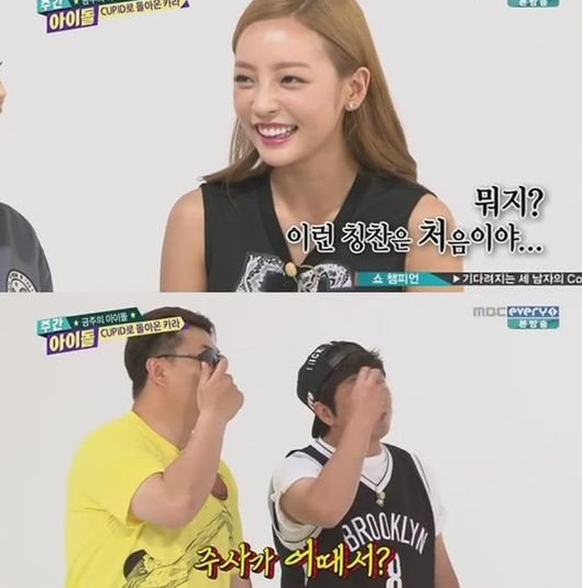 10일 오후 방송된 MBC 에브리원 예능프로그램 '주간아이돌'에서 정형돈은 "하라 피부가 정말 좋다"라고 극찬했다.