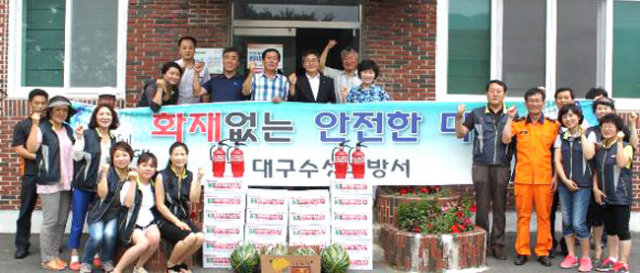 대구 수성소방서(서장 도기열)가 최근 소방서와 멀리 떨어져 소방차 출동이 늦은 달성군 가창면 오리와 상원리 100가구에 소화기 100개를 지원하는 '화재 없는 안전마을 행사'를 개최했다.