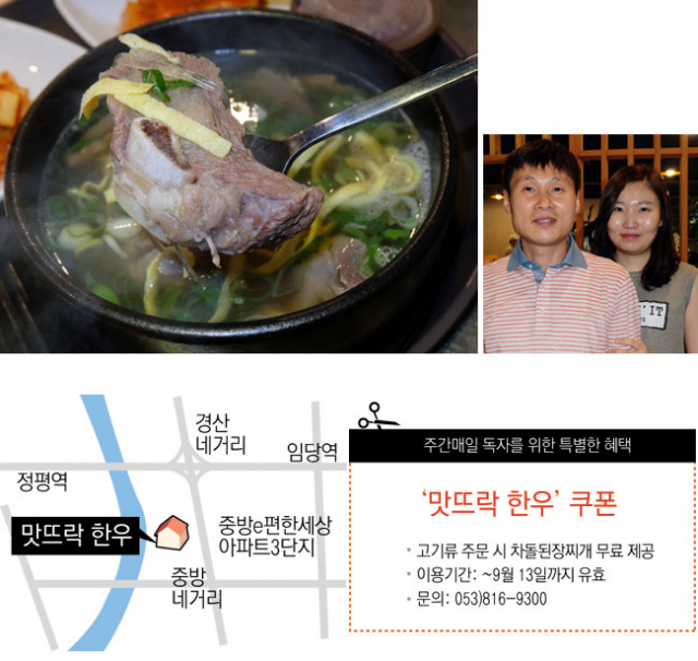 하지만 경북 경산시에서 저렴한 가격으로 나라 사랑하는 마음을 실천할 수 있는 곳을 찾았다. 자동차 타이어 판매점인 '티스테이션' 정평점 윤종규(51) 대표와 직원들은 근처에 있는 '맛뜨락 한우'가 그런 곳이라고 말했다.
