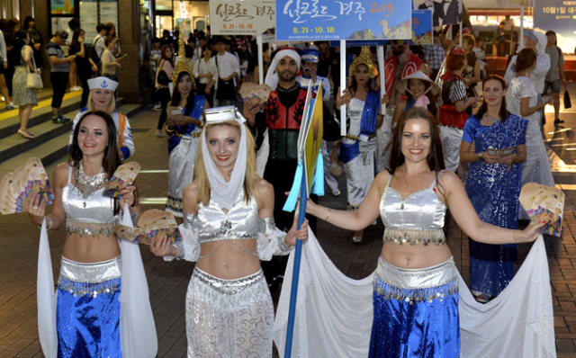 31일 대구 중구 동성로에서 '실크로드 경주 2015'에 참가한 외국 공연단원들이 각국 전통의상을 입고 거리 퍼레이드를 펼치며 시민들에게 홍보 팸플릿을 나눠주고 있다.