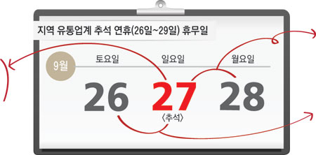 유통업계 관계자는 "올해 추석 연휴가 대체 휴일까지 포함해 나흘인데, 영업점마다 휴무일이 다르기 때문에 쇼핑 가기 전에 휴무일을 확인할 필요가 있다"고 했다.