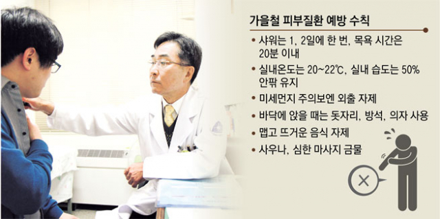 특히 아토피 피부염이나 건선 등의 질환은 가을철에 더욱 악화되기 쉽다. 피부 건조증이 생기면 피부가 하얗게 일어나고 가려움증이나 갈라짐 등의 증상이 나타난다. 주로 종아리나 허벅지 등 다리 부위와 팔에서 시작돼 옆구리와 마찰이 심한 부위, 허리 주위 등 온몸으로 퍼진다.