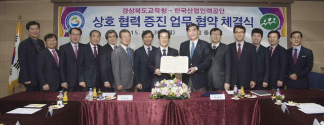 경상북도교육청(교육감 이영우)은 30일 포항 장흥중학교에서 한국산업인력공단(이사장 박영범)과 업무 협약을 맺었다. 이번 협약은 내년 중학교 자유학기제가 전면 시행됨에 따라 학생들이 진로 탐색과 직업 체험을 하는 데 도움을 주기 위해 체결한 것이다.