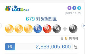 이번회차 로또 당첨번호는 '3·5·7·14·26·34'번, 2등 보너스번호는 '35'번이다.