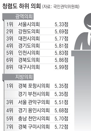 국민권익위원회는 23일 62개 지방의회(광역의회 17개, 기초의회 45개)를 대상으로 실시한 '2015년도 지방의회 청렴도 측정' 결과를 발표했다.