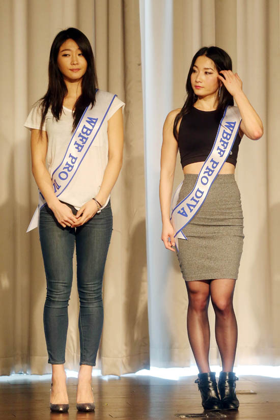 10일 오후 서울 강남구 신사동 리버사이드 호텔에서 열린 세계적인 피트니스 대회 'WBFF(World Beauty Fitness & Fashion) ASIA 프로 창단식'에서 참가 선수 서보라(왼쪽), 고민수가 포즈를 취하고 있다. 2106.4.10 연합뉴스