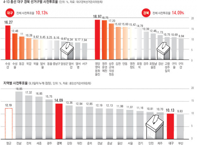 대구는 격전지일수록 사전투표율이 높았다. 2위에는 12.48%인 수성을이 이름을 올렸다. 수성을은 새누리당 이인선 후보와 이 지역 현역 3선으로 새누리당을 탈당한 무소속 주호영 후보가 경합을 벌이는 지역이다. 3위는 동갑(11%)이었다. 이 지역 역시 '진박' 정종섭 새누리당 후보와 탈당파 무소속 류성걸 후보가 엎치락뒤치락하는 곳이다. 무소속 권은희 후보가 출마한 북갑의 사전투표율도 10.28%를 기록해 평균을 웃돌았다.