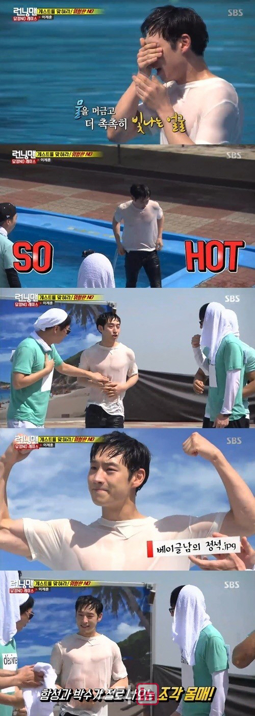 이에 '런닝맨' 멤버들은 "우와", "수건 주지마 버려 버려"라고 외치는가 하면 "이게 잔 근육이.."라고 이제훈의 몸을 칭찬해 웃음을 더했다.