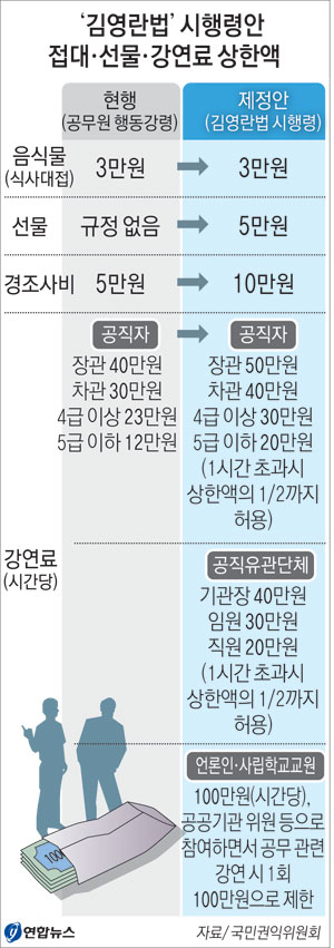 축산업계와 화훼업계는 '생존권을 위협받고 있다'며 반발하고 있다. 국내에서 꽃은 80% 이상이 경조사용으로 사용되는데 화환가격은 10만원 이상이 대부분이다. 한우 역시 20만원 이상 제품이 많아 시행령안대로라면 현실적으로 영업이 불가능하다. 황엽 전국한우협회 전무는 "한우 선물가격은 20만원이 넘는 경우가 대부분인데 선물상한액을 5만원으로 정해버리면 한우 대신 수입고기만 선물하라는 말이다. 부정부패 방지하려다 농민들을 다 죽이게 생겼다"고 반발했다.