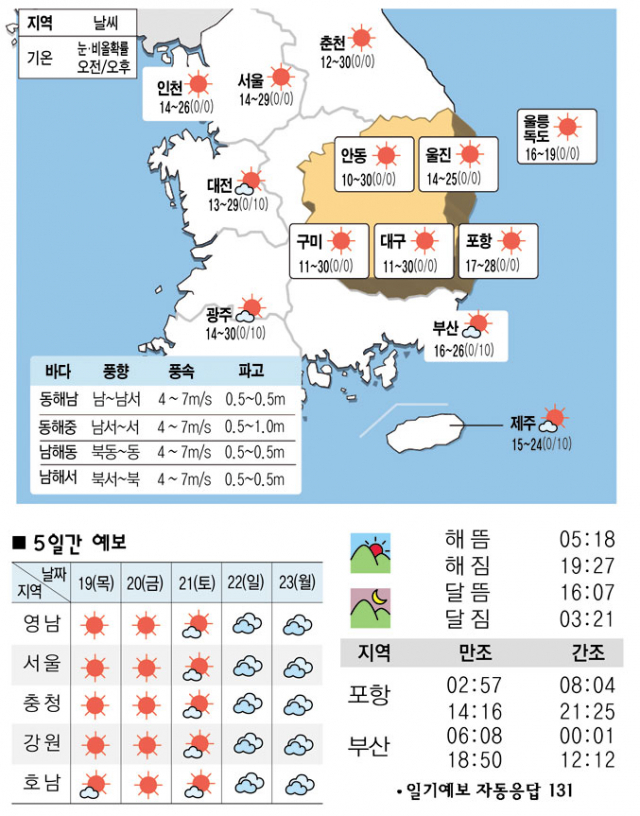 대구경북은 서해상에서 동진하는 고기압의 영향을 받아 맑겠음. 울릉도'독도 맑겠음.