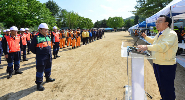 이날 봉화 물야저수지 일대에서 경북도, 봉화군, 국민안전처, 민간단체 등 10개 기관, 400여 명이 참여하는 저수지 붕괴'침수 현장 종합훈련을 했다. 이번 훈련은 '2016 재난대응 안전한국 훈련'으로 재난상황 발생 시 대응 매뉴얼을 현장에 실전 가동해 관계기관과 협업체계를 점검하고 초기대응 역량강화를 위해 열렸다.