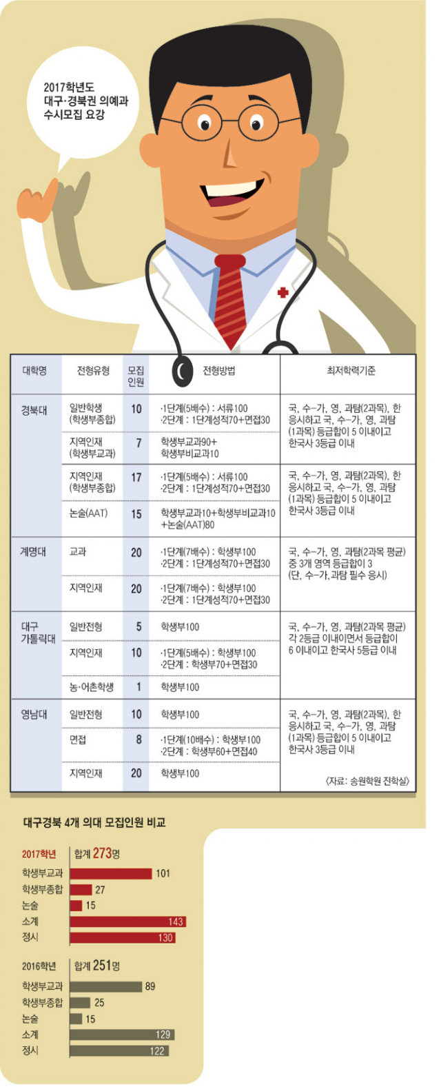 지난해에 이어 2017학년도 대구경북 지역 4개 의대의 선발 인원은 소폭 늘어났다. 영남대 의학전문대학원이 의대로 전환함에 따른 것이다. 모집정원이 늘면서 덩달아 지역의 자연계 상위권 학생 중 상당수가 의대 수시전형을 준비할 것으로 보인다. 경북대, 계명대, 대구가톨릭대, 영남대 등 지역 4개 대학의 2017학년도 의대 수시모집 특징과 대비 전략을 알아본다.