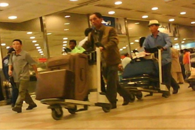 북한은 쿠웨이트 건설현장에서 일하던 파견 노동자 수십 명이 집단 파업 등 물의를 빚자 이들을 강제 소환했다고 미국 자유아시아방송(RFA)이 8일 보도했다. 사진은 지난달 17일 북한 해외 노동자들이 쿠웨이트 국제공항을 빠져 나가는 모습. 2016.6.8 연합뉴스