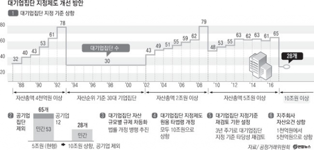 대기업집단 지정 기준 상향은 2008년 이후 8년 만이다. 대기업집단 기준은 1987년 도입 당시 자산 규모 4천억원으로 출발했다. 1993~2001년 자산 총액 기준이 아닌 '자산 규모 상위 30위' 기업을 규제했다가 다시 총액 기준으로 바꿨다. 2002년 자산 규모 2조원 이상에서 2008년 5조원으로 상향 조정됐다. 공정위는 2007년 말부터 지난해 말까지 국내총생산(GDP) 증가율(49.4%), 지정집단 자산합계'평균 증가율(101.3%'144.6%) 등을 고려해 지정 기준을 10조원으로 상향했다.
