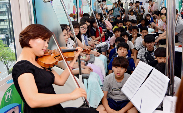 호국보훈의 달을 맞아 15일 도시철도 3호선 이벤트 열차에서 대구지방보훈청 주최로 '내일로 호국공감 톡톡콘서트 '가 열려 달구벌능금예술단원들이 콘서트에 참가한 학생들에게 전쟁가요를 들려주고 있다.