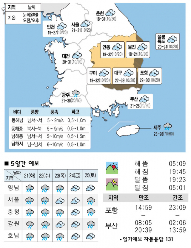 대구경북은 흐리고 천둥'번개를 동반한 비가 오는 곳이 있겠으니 시설물 관리와 안전사고에 유의 바람. 울릉도'독도 구름 많음.