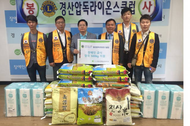 경산압독라이온스클럽 임병환 회장을 비롯한 회장단은 최근 창립 제22주년 기념 및 회장단 이'취임식 행사 때 축하 화환 대신 받은 양곡 500㎏을 장애인들에게 전달해 달라며 경산시장애인종합복지관에 전달했다.