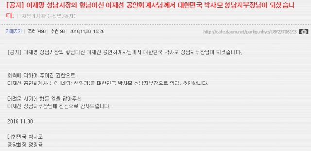 지난 달 30일(어제) '박사모(박근혜를 사랑하는 모임)' 공지사항에는 "이재명 성남시장의 형님이신 이재선 공인회계사님께서 대한민국 박사모 성남지부장님이 되셨습니다." 라는 제목의 글이 게재됐다.
