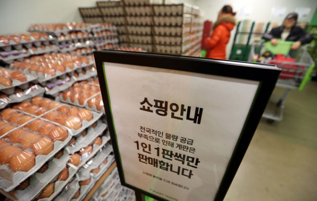 전국적으로 AI(조류인플루엔자)가 확산해 살처분한 가금류가 급증하면서 계란 수급에 비상이 걸렸다. 12일 대전의 한 대형 마트에 계란 '1인 1판' 안내판이 붙어 있다. 이 매장은 계란 물량을 맞추지 못해 하루 판매량을 300판(1판 30개)에서 200판으로 줄였다. 2016.12.12 연합뉴스