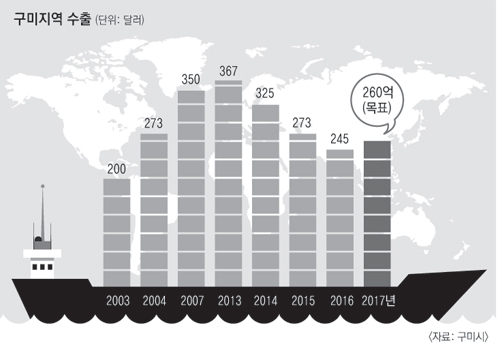 게다가 지난해 9월 삼성전자 갤럭시노트7 생산 중단 등 파문으로 국내 유일의 삼성전자 휴대전화 생산기지가 있는 구미가 수출 직격탄을 맞기도 했다. 구미의 수출 실적은 2003년 200억달러를 넘긴 후 2004년 273억달러, 2007년 350억달러, 2013년 367억달러로 매년 크게 늘었으나 2014년 325억달러, 2015년 273억달러, 지난해는 245억달러를 기록하면서 13년 전 수준으로 되돌아갔다.