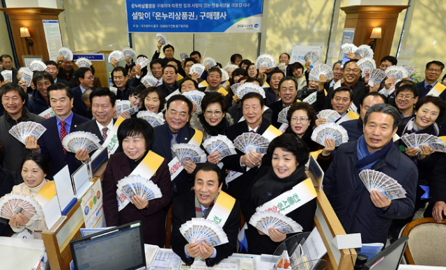 설 명절을 앞두고 11일 대구은행 중구청지점에서 대구 중구청 주최로 '전통시장 온누리상품권 구매' 행사가 열렸다. 행사에 참가한 중구청 직원, 중구 각 협의단체 회원 및 주민들이 구매한 온누리상품권을 들고 전통시장 이용 캠페인을 펼치고 있다.