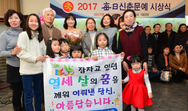한국 문단을 대표하는 최고의 작가 등용문인 매일신춘문예가 올해로 60주년을 맞았다. 11일 오후 매일신문 11층 대강당에서 열린 '2017 매일신춘문예 시상식'에서 성주희(뒷줄 왼쪽에서 네 번째'동화 부문) 씨와 가족, 친지, 심사위원 등 관계자들이 '열세 살의 꿈'을 이룬 성 씨의 수상을 축하하며 기념 촬영을 하고 있다. 성 씨는 "30대에 접어든 어느 날, 열세 살 때 쓴 일기장에 '동화작가가 되겠다'는 다짐을 보고, 그제서야 잊고 있던 꿈이 되살아나 그날부터 동화를 쓰기 시작해 드디어 꿈을 이루게 됐다"며 기뻐했다.