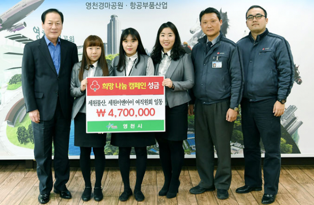 자동차부품기업인 세원물산 및 세원이엔아이 여직원회가 18일 이웃돕기 성금 470만원을 영천시에 기탁했다.