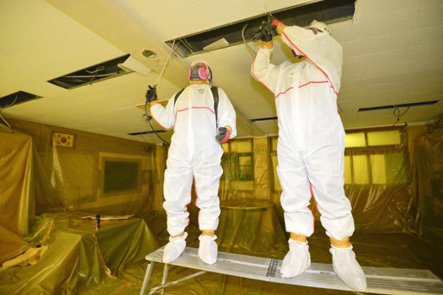 대구시 교육청이 각급 학교 교실 천장의 석면 자재 철거 공사를 본격 진행 중이다. 교육청은 올해 방학을 활용해 28개 초중고교, 2천여 개 교실의 천장 석면 자재를 철거할 계획이다. 교육청에 따르면 지난해 37%였던 대구의 석면 자재 포함 학교 비율이 2019년이면 29%대로 낮아질 것으로 예상하고 있다. 25일 대구 시내 한 중학교에서 업체 직원들이 이중으로 밀폐한 교실에 들어가 작업 시작 전 철거 모습을 공개했다.