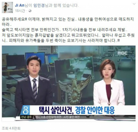 그는 "6남매중 넷째인 28살 제 여동생 민경이는 요즘 뉴스에서 다뤄지고 있는 '목포택시살인사건' 피해자이다"며 "죽어간 제 동생은 돌아오지 못할 길을 갔지만, 사실을 제대로 알려서 범인이 충분한 처벌을 받길 바란다"고 말한다.