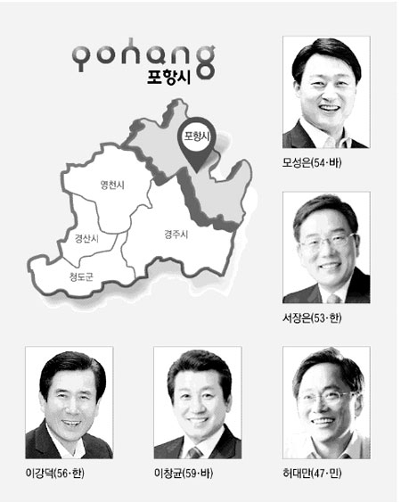 내년 치러질 포항시장 선거전은 자유한국당 대 바른정당의 양당 싸움으로 예상된다. 보수 성향이 강한 지역 정서상 정통보수를 자처하는 양당의 후보들이 맞붙을 가능성이 높게 점쳐지고 있기 때문이다. 실제로 한국당의 현 이강덕(56) 시장과 바른정당의 모성은(54) 한국지역경제연구원장, 이창균(59) 바른정당 포항남울릉 당협위원장이 도전장을 내밀고 있다. 한국당은 현재로서는 이 시장과 맞붙을 만한 도전자가 보이지 않고 있다. 도전자가 나타나더라도 이 시장과 경선에서 승리하기가 부담스러운 것이 사실이다. 그만큼 현직 프리미엄이 높기 때문이다.