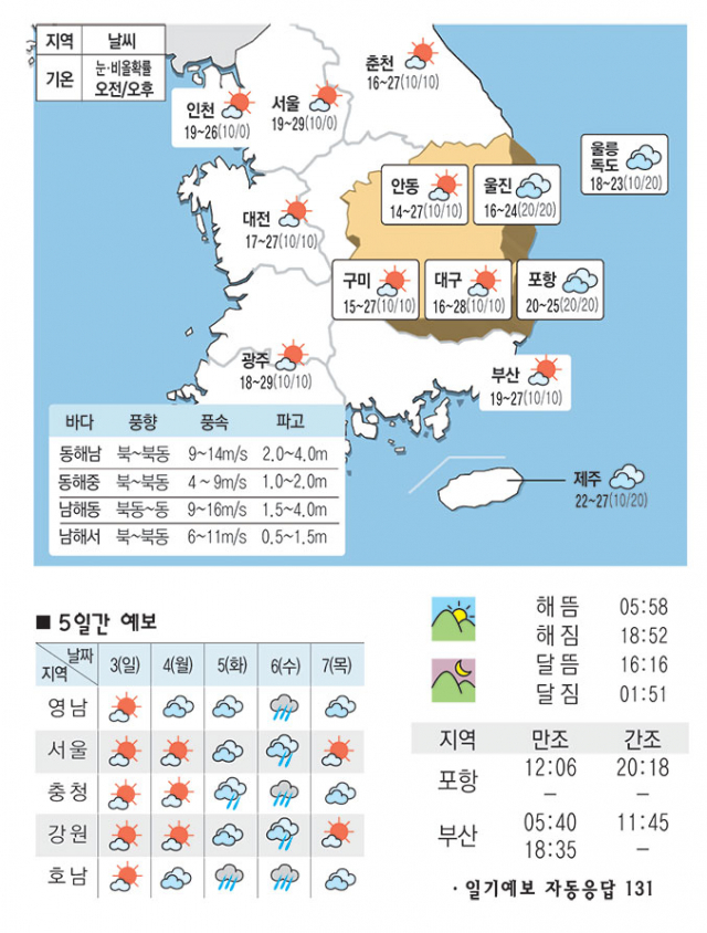 대구경북은 대체로 맑겠음. 동해안과 울릉도'독도는 가끔 구름 많음. 당분간 내륙 중심으로 낮과 밤의 기온차 크겠으니 건강관리에 유의 바람.