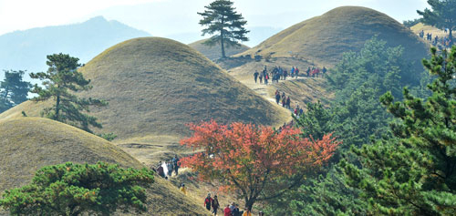 신라 왕들도 이런 느낌으로 가을 풍경을 감상하며 길을 걸었을까. 왕릉을 '휘~' 타고 넘은 바람이 붉은, 때론 노란 비단옷으로 갈아입은 나무를 건드려 우수수 비단길을 만든다. 경주의 가을 길을 걸으면 누구도 신라 왕이 눈에 담았던 정취를 느끼지 않을 수 없다.