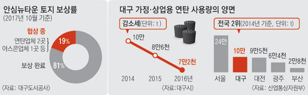 이후 토지와 시설에 대한 보상 절차가 진행됐다. 대구도시공사에 따르면 지난달 기준 보상률은 81%에 그친다. 나머지 부지를 점유하고 있는 업체 3곳과의 보상 협상이 난항에 빠져 있어서다. 연탄업체들은 "대체부지를 마련해주지 않으면 이전할 수 없다"고 반발하고 있다.