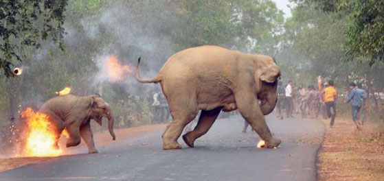 인도 동부에서 군중이 던진 불덩이를 피해 도망치는 코끼리들의 사진이 공개돼 충격을 주고 있다고 영국 일간지 가디언과 데일리메일 등이 7일(현지시간) 전했다. 이 사진은 야생동물 사진가 비플라브 하즈라가 인도 동부 서벵골주 반쿠라에서 촬영한 것으로 최근 인도 야생동물보호 잡지 '생크츄어리'(SANCTUARY)가 주최한 사진 경연대회에서 '올해의 생크츄어리 야생동물 사진가' 상을 받았다. 2017.11.8 [sanctuaryasia 홈페이지 캡처=연합뉴스]