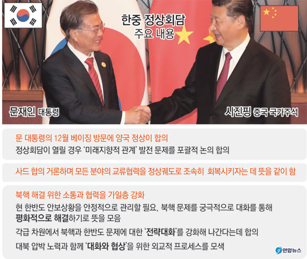 회담의 최대 결과물은 문 대통령의 12월 베이징(北京) 방문에 양국 정상이 합의한 것이다. 이는 정상 간의 교류로 본격적인 관계 개선의 물꼬를 트는 의미를 갖는 것으로 평가된다.