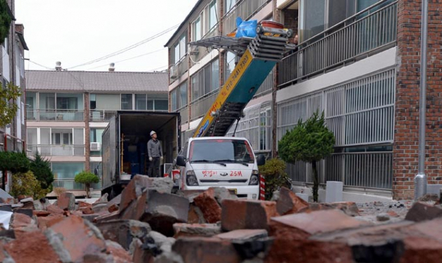 지진 피해를 입은 대동빌라 이재민들이 22일 오전 임대아파트로 보금자리를 옮기기 위해 이삿짐을 내리고 있다.