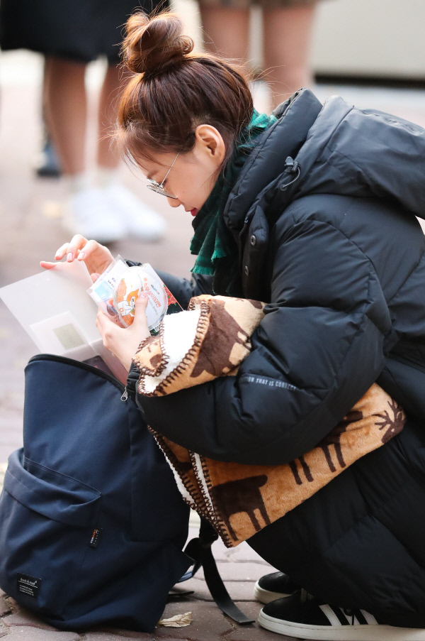 입실 마감 시간 30분 전인 7시 40분 쯤 도착한 김도연은 롱패딩에 머플러를 둘러 따듯함을 강조했으며, 머리를 단정하게 틀어 올리고 귀여운 안경을 써 수험생 패션을 완성 시켰다. 손에는 무릎 담요를 들고 있었다.