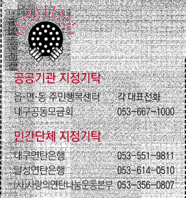 차가운 바람이 부는 비산동 골목길. 국민건강보험공단 대구본부 직원 30여 명이 연탄 배달에 구슬땀을 흘리고 있다. 이들은 대구연탄은행이 전개하는 연탄 나눔 운동에 동참했다. 직원들은 연탄은행이 제공한 특수 제작 리어카 7대에 연탄을 가득 싣고 골목길을 누볐다. 리어카 한 대에는 연탄 100장씩 실렸다. 연탄 무게만 무려 400㎏ 정도 된다. 리어카마다 봉사자 4명이 붙어 밀고 끌기를 반복했다. 골목길은 비좁고 비탈졌다. 배달할 가정에 도착했지만 리어카가 들어가기 어려웠다. 봉사자 10여 명이 20m 인간띠를 만들었다. 손에서 손으로 이어지는 연탄은 사랑의 파도처럼 보였다. 30여 분만에 100장의 연탄을 창고에 쌓았다. 봉사자들은 얼굴에 묻은 연탄 검정을 바라보면서 웃기도 했다. 국민건강보험공단은 연탄 5천 장 기부약정을 하고 우선 7가구에 1천800장 연탄 배달을 했다. 직원들은 "우리 주변에 연탄을 때는 이웃을 보니 마음이 아프다"며 "추운 겨울 조금이라도 훈훈하게 지냈으면 좋겠다"고 바랐다.