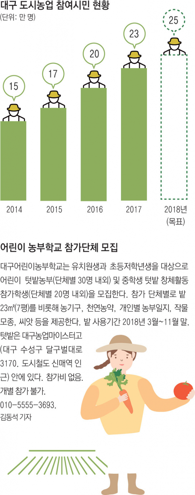 25일 대구농업마이스터고 정문 서쪽에 자리 잡은 대구도시농부학교 텃밭. 여성 농군 김효선(51) 씨가 장화를 신고 밭에 나왔다. 추운 겨울은 지나가고 따스한 봄볕이 땅바닥에 내려앉았다. 밭에는 작년 가을에 파종한 봄동과 상추가 비닐하우스 안에서 파릇파릇 자라고 있다. 그는 오늘 저녁에 봄동을 뜯어 쌈밥을 해먹을 요량이다. 과도로 봄동 아래를 조심스레 자르니 손바닥만 한 봄동이 먹음직스럽다. 봄동은 고소하면서도 진한 향기를 내뿜고 있다. 봄동 다섯 뿌리를 잘라 소쿠리에 담고는 옆쪽 고랑에 있는 무구덩이로 자리를 옮겼다. 괭이로 구덩이 흙을 살살 걷어내니 겨울을 견딘 싱싱한 무가 얼굴을 내밀었다. 그는 가을에 수확한 농작물을 흙에 파묻어 놓고 꺼내 먹는 재미가 쏠쏠하다고 했다. 그는 무 3개를 꺼내 소쿠리에 담고 다시 흙을 덮었다. 또 옆 두둑 맨땅에는 시금치가 땅위에 바짝 붙어 있다. 겨울 내내 삭풍을 견디며 살아있었다. 그는 시금치 몇잎도 뜯었다. 그리고 농장 그늘막 창고 줄에는 무청이 말라 시래기가 돼있었다. 그는 해가 질무렵 서둘러 범어동 집으로 떠났다.