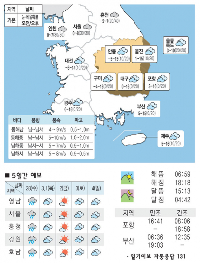 대구경북과 울릉도·독도는 대체로 맑다가 구름 많아짐. 봄날처럼 날씨가 포근하나 대기는 건조하니 산불 등 각종 화재 예방에 주의 바람.