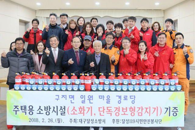 달성소방서(서장 남은석) 119시민안전봉사단(단장 김광일)은 26일 달성군 구지면사무소에서 주택 화재예방을 위해 소화기 27개, 화재경보기 54개를 구지면 일대 경로당 27곳에 전달했다.