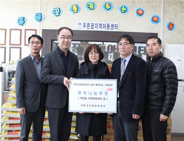 한국건설관리공사(사장 이명훈)는 27일 김천 푸른꿈지역아동센터(센터장 이경희)를 비롯해 사회복지시설, 노인요양시설 4곳에 백미와 라면, 재생PC 등 '행복나눔 후원품'을 전달했다.