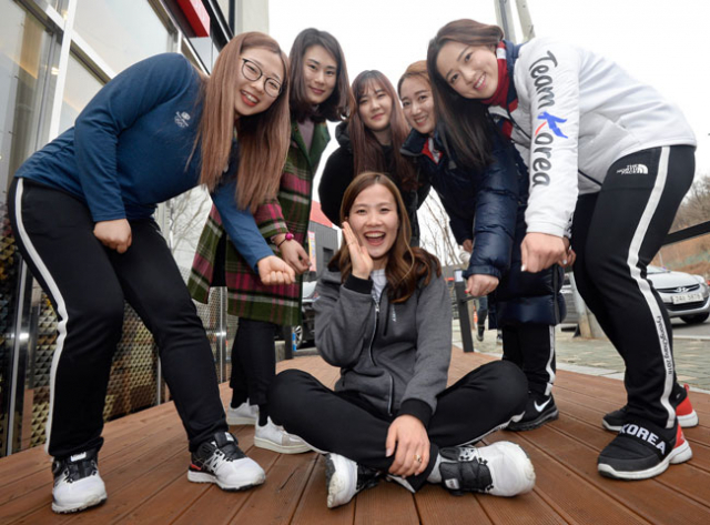 대구를 방문한 2018 평창동계올림픽 최고의 스타 여자 컬링 국가대표팀이 27일 매일신문 독자들을 찾았다. "영미"를 외치고 있는 김은정(맨 앞 가운데) 스킵(주장)을 비롯해 선수, 감독이 스위핑 포즈를 취하고 있다. 왼쪽부터 김선영 선수, 김민정 감독, 김초희'김영미'김경애 선수.
