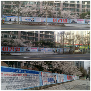 무소속으로 재선에 도전하는 이강열 북구 구의원은 길이가 무려 50m에 이르는 '기차 현수막'으로 지역에서 유명세를 타고 있다. 현수막에는 지역구 지도'현황'정책'공약 등이 상세하게 담겨 있다. 그는 "긴 현수막은 주민 시선을 사로잡을 뿐 아니라 여러 공약을 써넣을 수 있어 주민 알권리 차원에서도 만점"이라고 설명했다. 이남훈 정의당 중구 가선거구 후보는 평상복 차림에 노란 스카프를 둘러매 눈길을 끈다. 이 후보는 "노란 스카프는 중구라는 세련된 이미지와 함께 30, 40대 여성 유권자를 겨냥해 연출한 아이템"이라며 "지역에서 이름 석 자보다 노란 스카프 사나이로 통하고 있을 정도로 홍보효과를 보고 있다"고 귀띔했다.