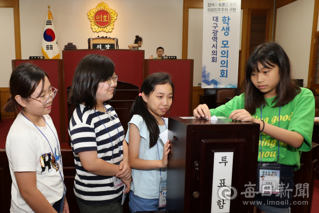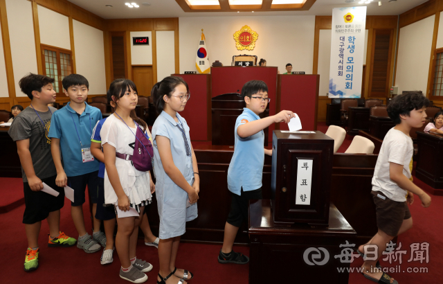 '2018 청소년 정치 아카데미' 가 대구시선관위와 대구시, 대구시교육청 주최로 1일 대구시의회 본회의장에서 열린 가운데 경북대사대부속초교를 비롯한 12개교 학생 39명이 모의 의장 선거를 하며 의회 체험을 하고 있다.